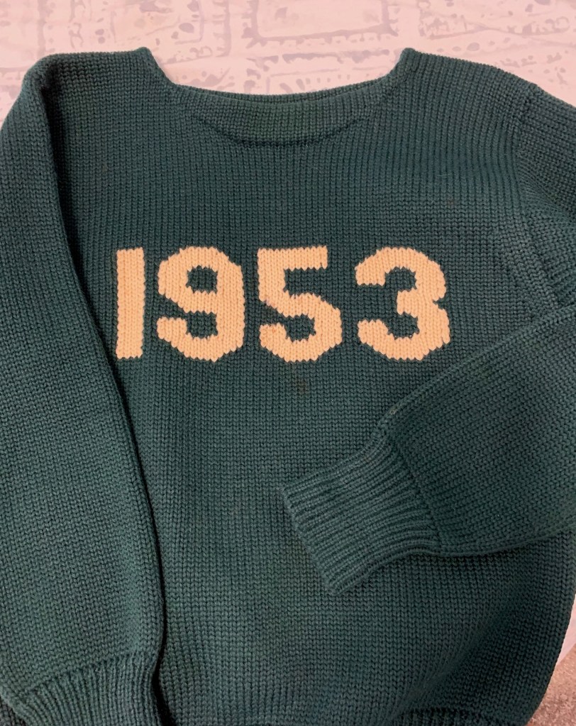 Then there is my dad’s college sweater from when he was on the ski team. Thick wool, with the year, 1953, big and bold across the front. None of us kids have ever worn that sweater. I have kept it carefully stored, and every now and then get it out to look at it and consider all that was going on when that sweater came to be. The Korean war was over, my dad was back home. He went back to college, married my mom, and somewhere along the way did ski jumping on a team. Bits and pieces of stories he used to tell us float through my head, and I wish I had been better about writing them down. Instead, there are stories secretly woven into that wool, just waiting for my imagination to make them come alive.